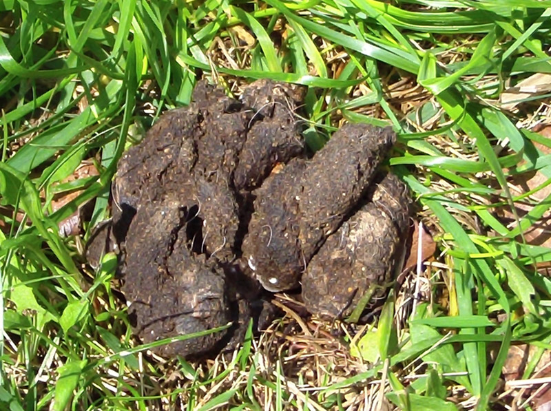 The waste has broken down so much that it is now in pieces. Bacteria and fungi have decomposed most of the organic matter with their enzymes, reducing it to carbon, nitrogen, and oxygen. Notice the bare grass in the shape of the pile’s original size. Fecal waste is so dense that it stops any sunlight from penetrating through, hence the grass underneath cannot perform its photosynthesis to survive.